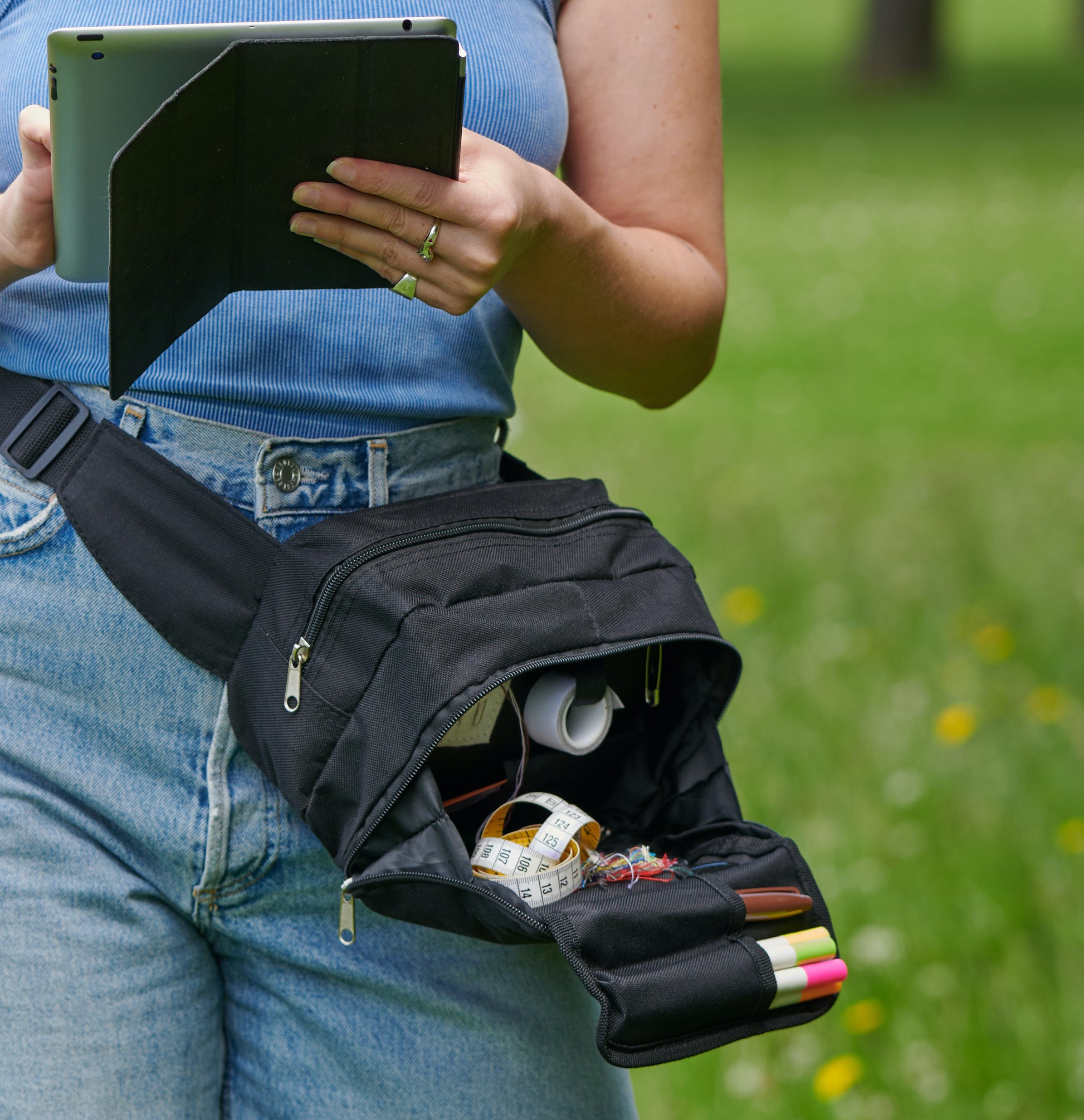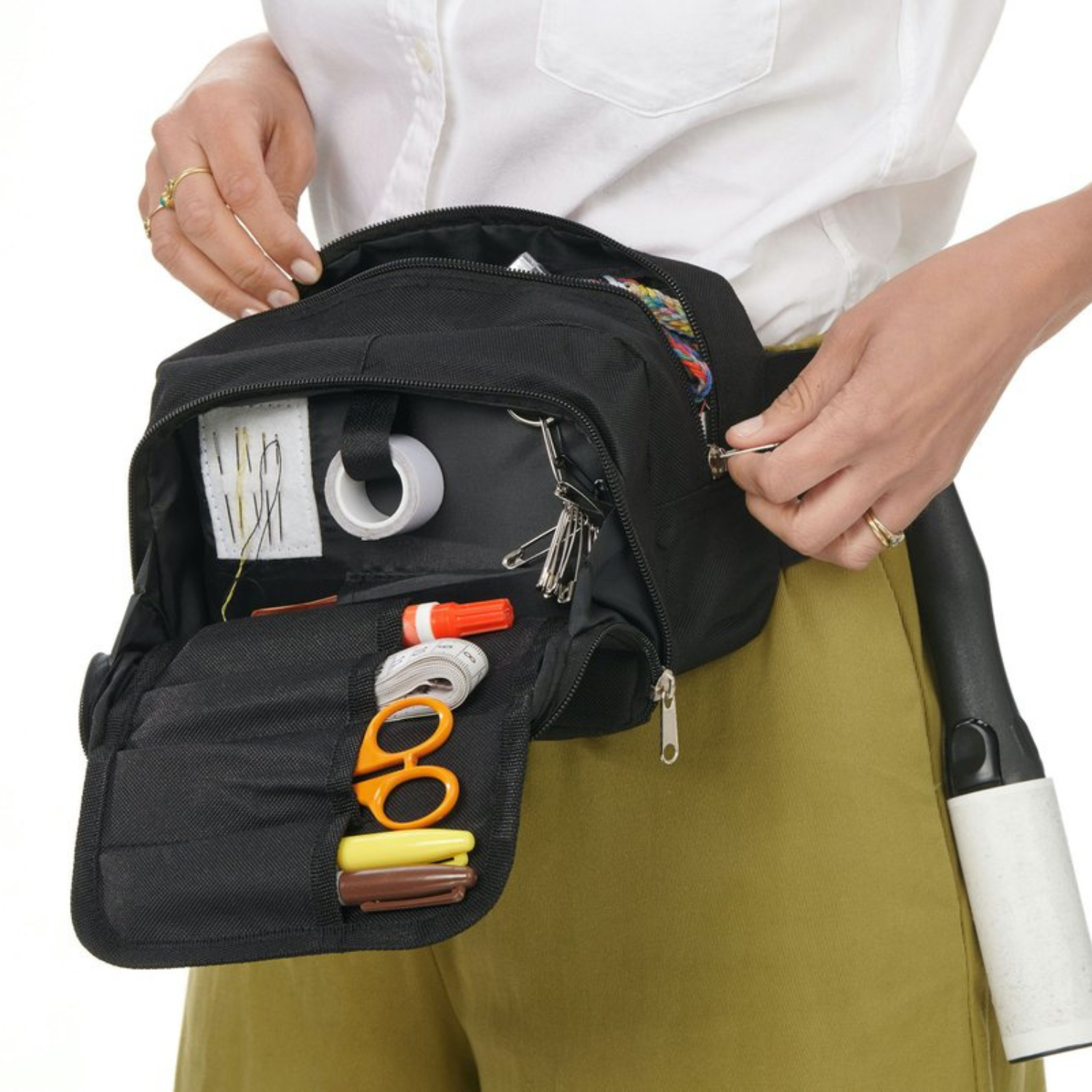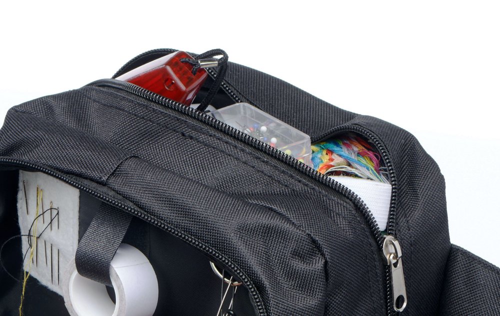 Made up of 3 main sections with lots of pockets and compartments to store all your essentials, a long adjustable strap, a soft neoprene handle. It'll fit your lint roller, tape, pins, needles, tablet, in short everything you need.