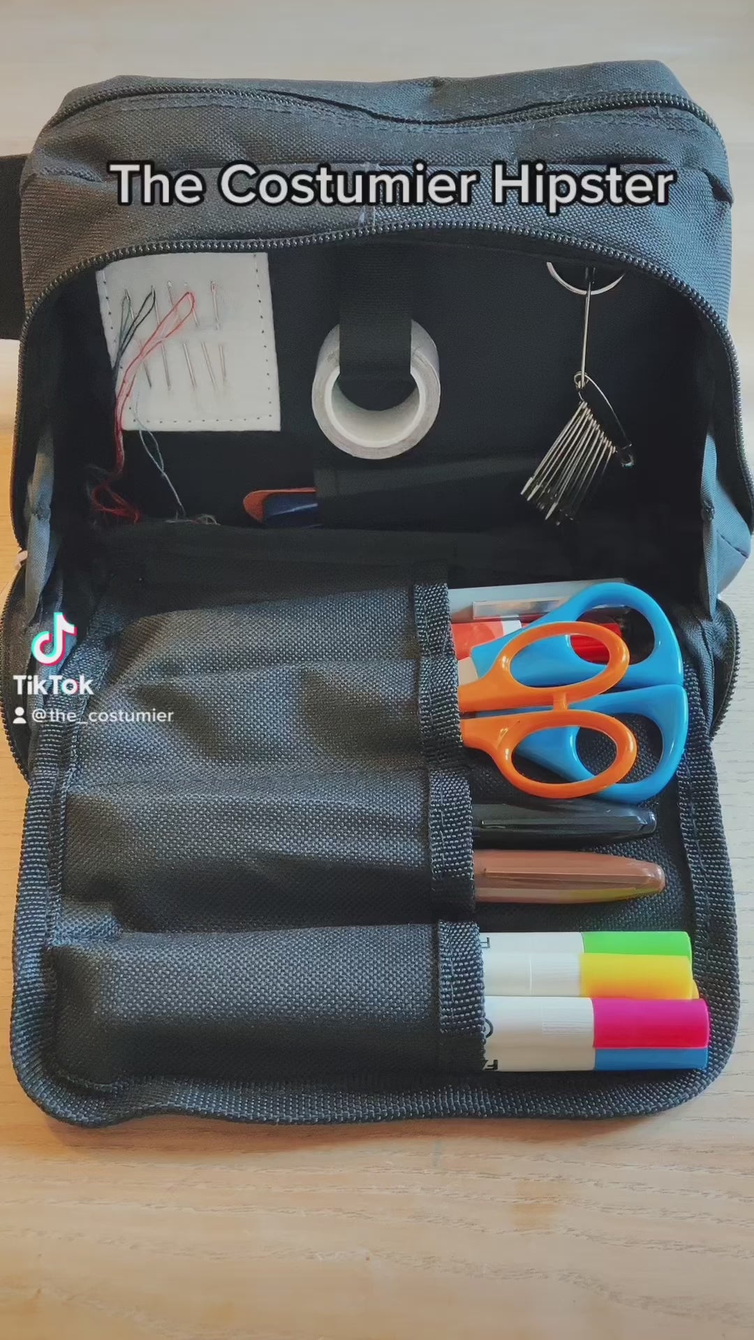 It has a large compartment at the base, perfect for storing wet wipes, heat packs etc, a strip for holding pre-threaded needles for quick and easy access, elastic strips on the inside to hold call sheets and sides, webbing loop and fastening to hang tapes, a pocket on the inside to hold mobile phones or your personal bits all with a sleek black lining.